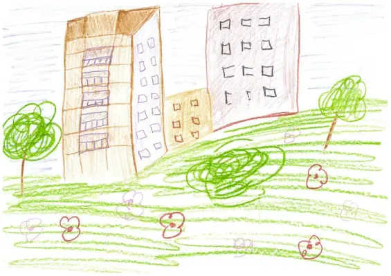На рисунке изображен мой двор. Там очень много цветов и деревьев. Я люблю играть во дворе и кормить птичек. Мы часто ходим гулять в наш двор. Я люблю свой район.