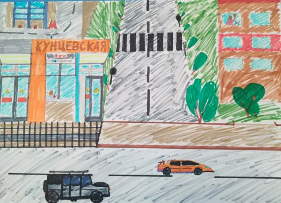 На работе изображёна девочка, которая смотрит в окно на станцию метро "Кунцевская". Торговый центр рядом с метро. Использованные материалы: бумага, простой карандаш, фломастеры.