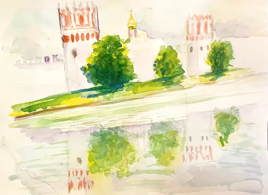 Здравствуйте уважаемые организаторы конкурса! Я раньше занималась в студии. Но недолго, пришлось бросить, так как я люблю кататься на коньках. Но я все равно люблю рисовать и участвовать в конкурсах. Мы с подружками ходим к Новодевичьему монастырю и рисуем его окрестности. Представляю вашему вниманию свой этюд.