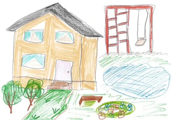 На работе изображен мой дом, качели, лавочка, цветник и кусты . Я очень сильно люблю свой двор. я часто играю там с подружкой Светой. Мне нравится проводить с ней время