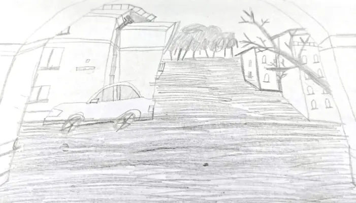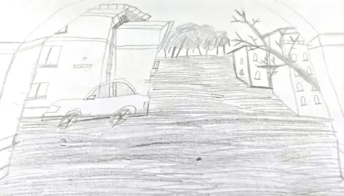 В своём рисунке решил показать вам свой двор. Я горжусь местом, где живу. Каждый день, смотря в окно, я любуюсь видом из окна, и он меня вдохновляет на новые рисунки