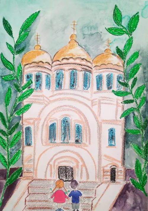 На рисунке изображены дети, которые идут в храм. Это Храм Иоанна Русского, который находится в нашем районе. Использованные материалы: акварельная бумага, простой карандаш, масляные мелки.