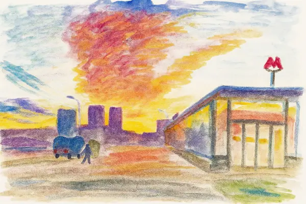 Небо окрашено в оранжево-красные цвета, солнце медленно прячется за горизонтом. Вдали видны силуэты зданий и высоких домов, а возле них — железная дорога метро. Там стоят станции, и люди спешат домой, их силуэты кажется маленькими. Всё вокруг наполняется тёплым и спокойным светом заката, и создаётся ощущение, что день подходит к концу.
