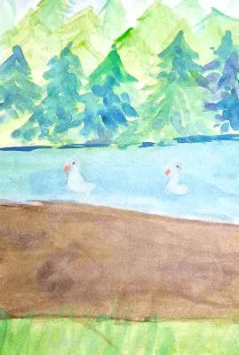 На моей картине изображены прекрасные белые лебеди, грациозно плывущие по водной глади.Вокруг царит атмосфера спокойствия и умиротворения. Вода изображена в нежных бирюзовых тонах, она отражает белоснежные силуэты птиц.