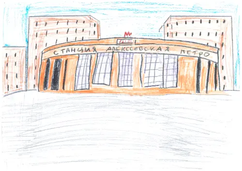 Когда я с мамой и папой ездим куда то в центр на прогулки, наша дорога всегда проходит через метро Алексеевская. Именно поэтому я нарисовала эту станцию.