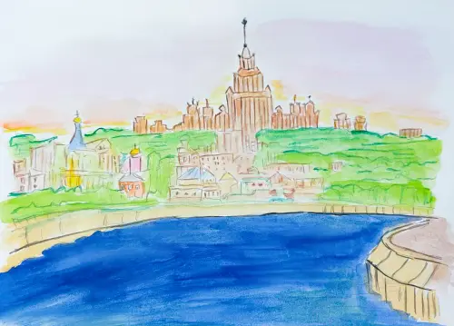 Мой рисунок называется «Вид на МГУ с набережной». Я постаралась акварелью передать, как красиво выглядит здание МГУ, когда оно видно издалека, из Хамовников, через воду и с набережной. Хоть башня и далеко, она всё равно очень заметная, словно гигантский замок на горизонте. Мне нравится, как акварель делает картинку такой воздушной и мечтательной.