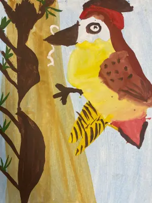 На рисунке изображен яркий, красивый дятел, которого видели в нашем лесу. Многие слышали, как стучит по дереву дятел. Таким образом, эта птица добывает себе пропитание, одновременно избавляя деревья от вредителей, обитающих под древесной корой.