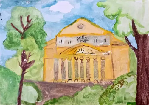 Ребенок нарисовал Большой театр, который видела гуляя по городу. Ей очень понравилось здание и атмосфера, которую Большой театр создаёт на площади