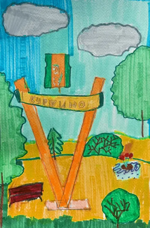 Нарисован главный вход в наш красивый район - всё зелёное, цветущее, а ещё использован герб нашего района - ландыши и цвета: зелёный и жёлтый, как солнце и зелень вокруг.