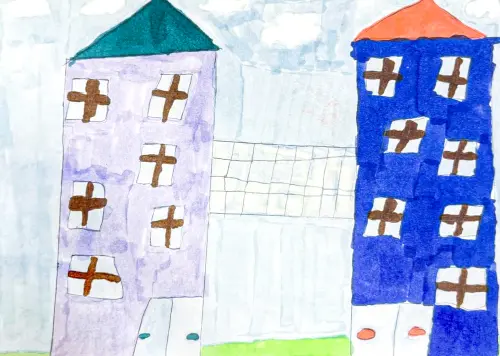 В Северном Тушино у каждого есть свой дом, и у меня тоже! А еще у меня есть много друзей, которые живут рядом! На моём рисунке домики стоят близко-близко, потому что мы всегда помогаем друг другу и вместе делаем наш район самым лучшим.
