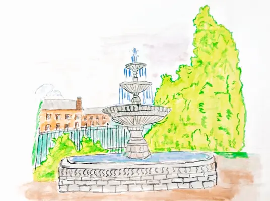 Я нарисовал фонтан, который видел летом на Девичьем поле. Он такой большой и красивый, вода в нём бежит и брызгает во все стороны. Солнышко светило очень ярко, и возле фонтана было так приятно и прохладно. Мне захотелось нарисовать это волшебное место акварельными красками, чтобы они были такими же прозрачными и лёгкими, как вода.