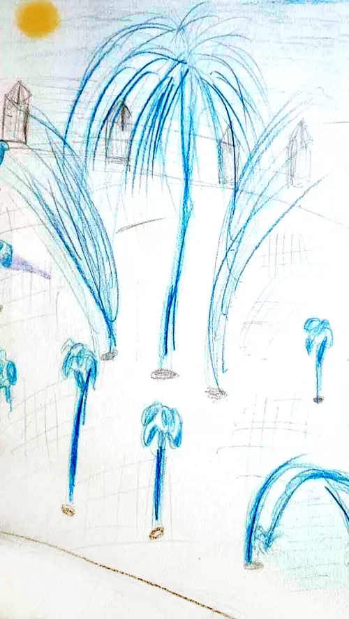 На картине изображён красивый фонтан на площади Юности в Зеленограде. В центре композиции — изящные струи воды, которые переливаются в лучах солнца, создавая радужные блики. Фонтан окружён нарядной плиткой, а вокруг него — просторная площадь, по которой гуляют горожане.