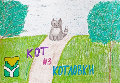 На рисунке изображён тёмно-серый кот с белой грудкой и полосатым хвостом. Он сидит на тропинке в парке «Сосенки». По краям видны ветки деревьев. В левом нижнем углу расположен герб Котловки. Рисунок выполнен восковыми мелками, карандашами и фломастером