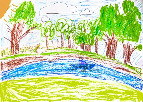 На рисунке изображен парк Кузьминки, пляж Верхнего Кузьминского пруда. Мы туда часто ходим, прогуляться среди деревьев, спрятаться от солнца, а потом погреться на солнышке на пляжу, на песочке.