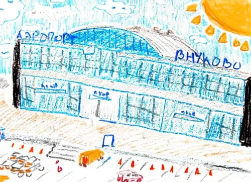 Я на своей работе изобразила аэропорт Внуково. Сейчас здание аэропорта Внуково - это новое современное здание. Я живу в районе Внуково, и из моего окна виден аэропорт, взлётные полосы. Я часто наблюдаю за самолётами и тоже мечтаю полететь куда-нибудь, поэтому я нарисовала аэропорт. Это символ моего района, здесь бывает большое количество людей каждый день, сюда прилетают гости нашей страны и все они видят новое и красивое здание нашего аэропорта. Внуково - это мой район.