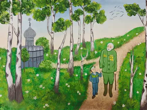 На своем рисунке я хотел изобразить храм, который стоит у нас в ландшафтном парке. Раньше он был маленький и деревянный, а теперь он большой и каменный, стоит на горе. Мы иногда туда заходим, когда гуляем в парке.