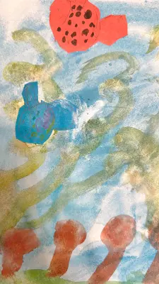 На рисунке изображён прямоугольный аквариум среднего размера, стоящий на деревянной тумбе. В аквариуме плавают несколько золотых рыбок и неонов. На дне лежат камни и коряги, а также растут зелёные водоросли.