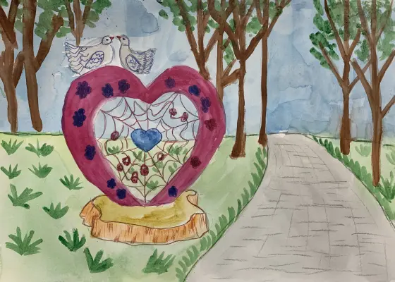 На моем рисунке изображена скульптура, которую я вижу, прогуливаясь со своей семьей в парке «Северное Тушино». Мы очень любим этот парк, так как там красиво и уютно. Работа выполнена акварелью и цветными карандашами.