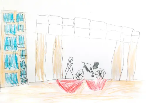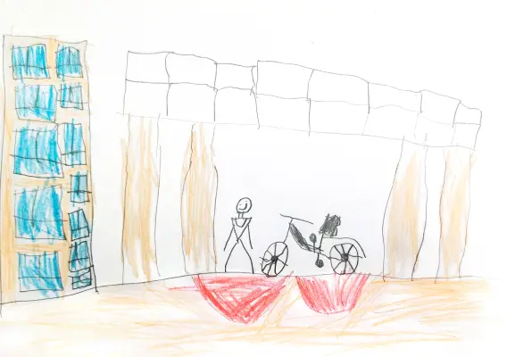 На рисунке изображён велосипед, который символизирует свободу, приключения и радость от открытий. Этот рисунок напоминает о том, как много счастья могут приносить простые вещи, такие как велосипед. Он передаёт атмосферу детства, его беззаботность и искреннюю радость.