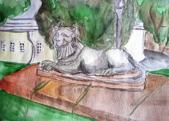 В парке «Кузьминки» много скульптур. Среди них чугунные египетские львы. Кузьминские львы изображены лежащими в спокойной и одновременно величественной позе, их грива напоминает полосатый платок фараонов — клафт. Очень нравится этот парк, и я люблю львов. Поэтому у меня и появился этот рисунок.