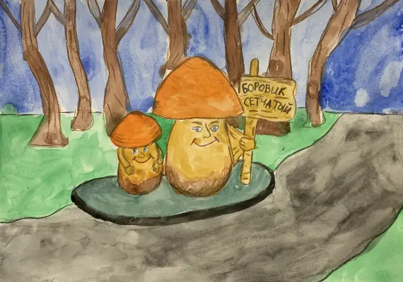 На рисунке я изобразил сказочные грибочки. Я видел эту скульптуру на выставке в парке «Северное Тушино», и она мне очень запомнилась. Моя работа выполнена акварелью и цветными карандашами.