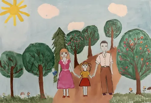 Прогулка в парке Яуза глазами пятилетней художницы – это не просто рисунок, это распахнутое окно в мир детской фантазии. На листе оживает солнечный день, сотканный из ярких красок и наивной непосредственности. Деревья тянутся к небу своими корявыми, но такими добрыми ветвями, словно приглашая поиграть в прятки.