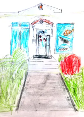 В своей работе я показал воскресную школу при храме, которую я посещаю с друзьями. Занятия проходят очень весело и интересно. Сейчас лето, и я скучаю по друзьям, с которыми там занимаюсь.
