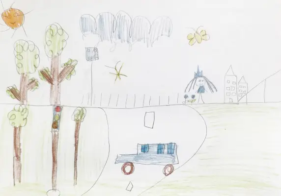 Этот рисунок отражает детскую способность видеть красоту и магию в повседневности. Принцесса — символ мечтаний и грёз, которые наполняют жизнь яркими красками и вдохновением. Рисунок показывает, как дети умеют находить сказочное в обыденном, превращая свой двор и дом в пространство для творчества и фантазии.