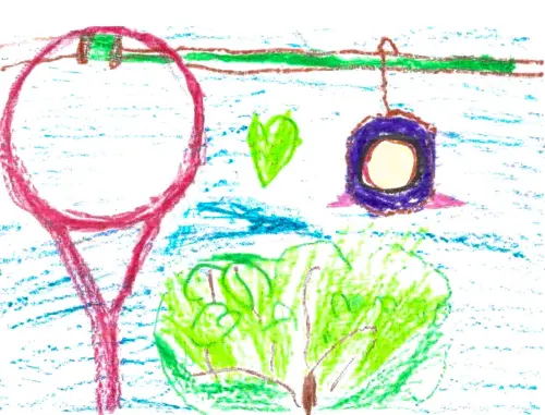 Рисунок выполнен карандашами. На рисунке изображена канатная дорога с прекрасным видом на чудесную природу.