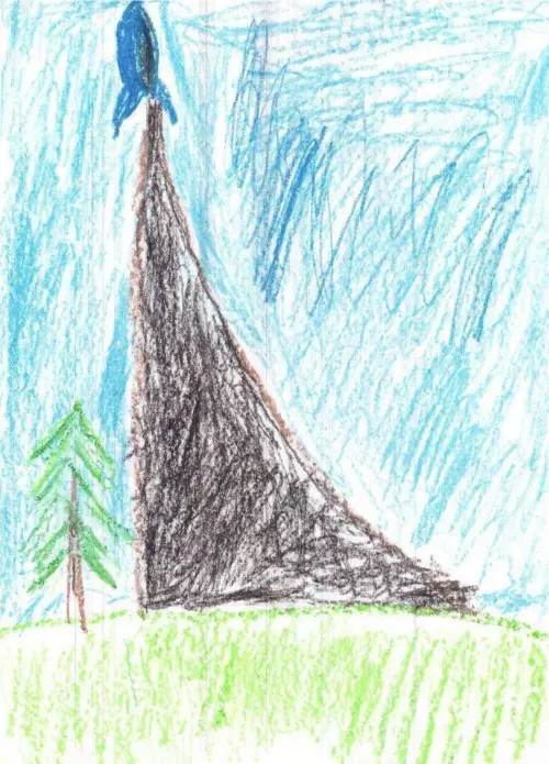 Рисунок выполнен карандашами. Стремящаяся ракета в небо на фоне природы.