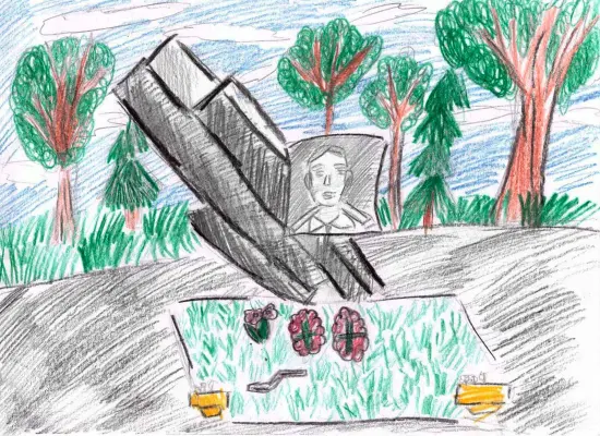 Рисунок, выполненный цветными карандашами, отражает глубокие чувства и впечатления юного художника. Каждый штрих и цвет передает эмоции, связанные с темой памяти и уважения. Цветовая палитра насыщенная и разнообразная; тёплые и холодные оттенки сочетаются, создавая атмосферу, полную значимости и исторической глубины.