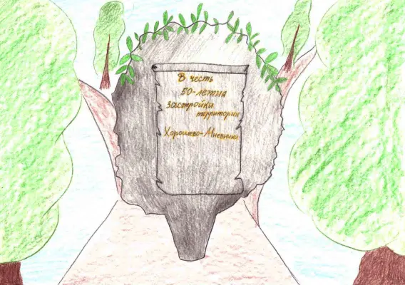 На листе формата A4 представлена работа, выполненная цветными карандашами, которая отображает атмосферу важного события, связанного с застройкой района Хорошево-Мневники. Цветовая палитра яркая и насыщенная, наполненная теплым светом, что создает ощущение праздника и радости. Каждый штрих передает положительные эмоции и демонстрирует живое восприятие окружающей действительности.