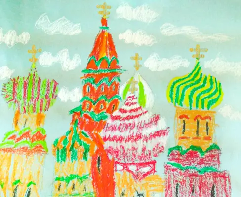 Известный во Всем Мире Храм Василия Блаженного, который находится в Москве на Красной площади. Вот такое интересное решение в выборе техники мы видим на работе у этого юного художника. Материал; тонированная бумага, цветные карандаши и цветные восковые мелки.