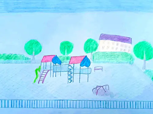 Я очень люблю мой двор в микрорайоне Курьяново. В нашем дворе очень хорошая и красивая детская площадка. На площадке много разных игровых конструкций, где я в свободное время гуляю. Работа выполнена цветными карандашами.