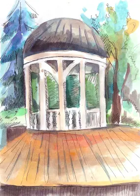 На листе формата A4 представлена акварельная работа, выполненная 12-летним мальчиком, изображающая Ротонду на бульваре Карбышева. Эта композиция пронизана атмосферой спокойствия и красоты городского пейзажа. Центральным элементом работы является изящная ротонда, которая аккуратно выполнена с использованием мягких акварельных тонов. Мальчик мастерски передал архитектурные детали, подчеркивая грациозные линии и округлые формы, которые наделяют её элегантностью и утонченностью. Окружающий фон выполнен в нежных пастельных оттенках, что придаёт работе легкость и воздушность. Бульвар Карбышева изображен с зелеными насаждениями, которые окружают ротонду, создавая гармоничное сосредоточение на центральном объекте. Теплые оттенки зелени усиливают ощущение летнего дня и природы, заполняющей пространство.