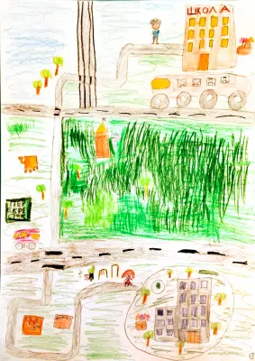 Рисунок выполнен пастелью и карандашом. Рядом с домом в шаговой доступности находятся парк, школа и магазины. Все очень удобно и комфортно.