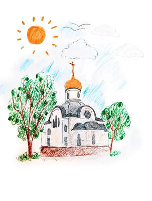 Целью этого рисунка было изобразить красивый храм, посвященный Святым Царственным Страстотерпцам. Я хотела передать радостное и светлое настроение. Мы посещали с родителями этот храм и мне захотелось выразить свое впечатление в рисунке.