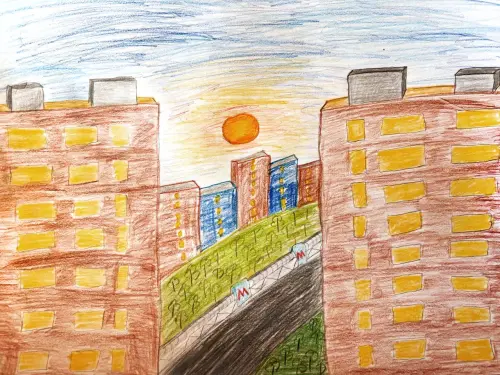 Рисунок на тему: мой любимый район, как это видит ребенок. Спокойный район, где много детских площадок, огромное пространство леса, где можно чудесно проводить время.