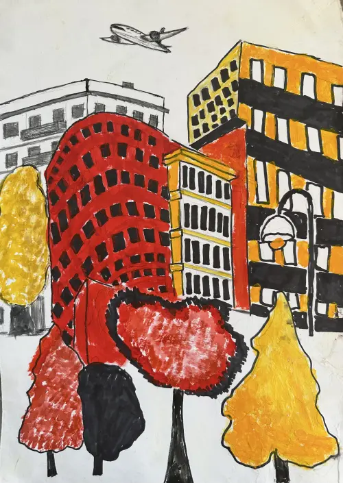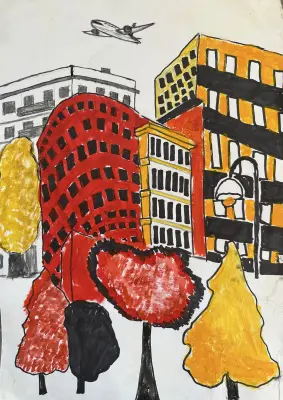 Я живу в очень живописном районе на юге Москвы. Здесь есть и пруды, и парки, и красивые аллеи, и необычной красоты здания. В своей графической работе я старалась передать цельность, яркость и красоту созданных человеком построек и окружающей среды.