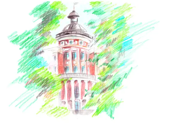 Работа, выполненная цветными карандашами, формата A4, погружает зрителя в атмосферу уюта и природной красоты. Перед нами раскрывается фрагмент красивого дома, который запечатлён сквозь густую листву деревьев. Листва, выполненная в легких, нежных оттенках зелени, создает эффект естественной рамки, обрамляющей дом. Разнообразие оттенков от яркого травяного до мягкого оливкового придаёт изображению живость и динамику.