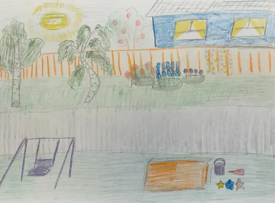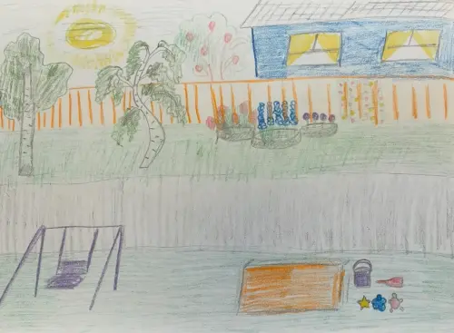 Нарисовала двор, где я живу. Свой двор я очень люблю, летом очень много игр во дворе, это и качели и лазелки и еще мы прыгаем и бегаем, катаемся на каруселях.