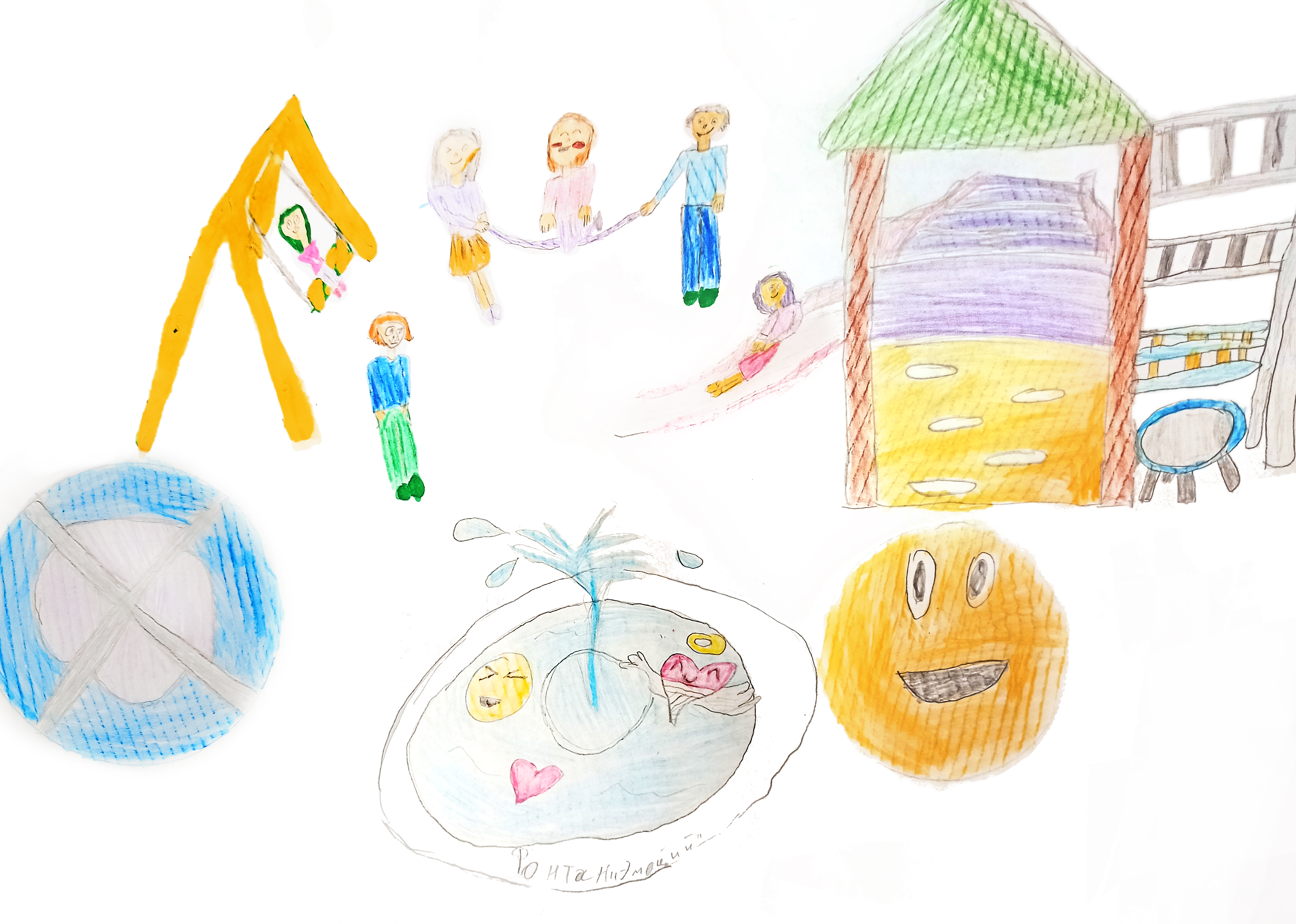 На этом ярком и живописном детском рисунке изображена уютная игровая площадка с большим фонтаном в центре. Вода из фонтана бьёт вверх и разбрызгивается, создавая веселую атмосферу. Вокруг расположены качели, горки и игровые сооружения, на которых играют счастливые дети. Весь рисунок наполнен радостью, движением и теплом солнечного дня.