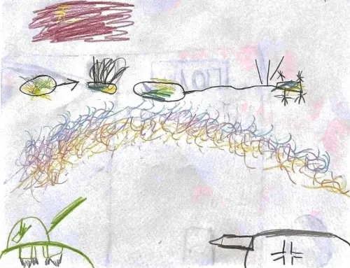 Лев уже знает историю своего района, видел нашу знаменитую «пушку» и памятник лётчику Талалихину. Поэтому на рисунке Лёва изобразил, как военный самолет защищает жителей города, танки идут в бой, вокруг очень страшно, но... всё точно будет хорошо, потому что НАШИ ПОБЕДЯТ!