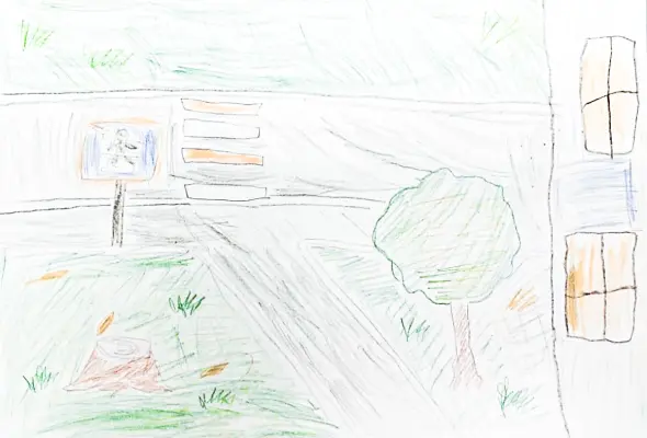 Рисунок выполнен цветными карандашами. Рядом с домом расположен сквер и самое главное-пешеходный переход, ведь даже в дворах необходимо соблюдать правила дорожного движения.