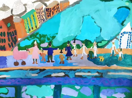 Я нарисовала летнюю московскую улицу, но необычную - она населена сказочными героями. Они с удовольствием гуляют, радуются и веселятся.