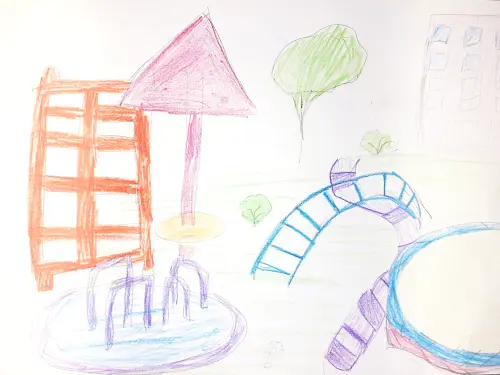 Моя работа о моей любимой площадке, я на ней с сестрой и с подругой, мы качаемся на качелях, лазим по лестнице. Хорошо, что площадка около дома и мама из окошка нас видит.