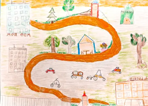 Рисунок выполнен цветными карандашами и пастелью. Идя из школы я прохожу другие дома, сквер, магазины и мост. Мне нравится гулять после школы до дома.