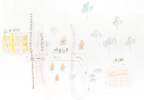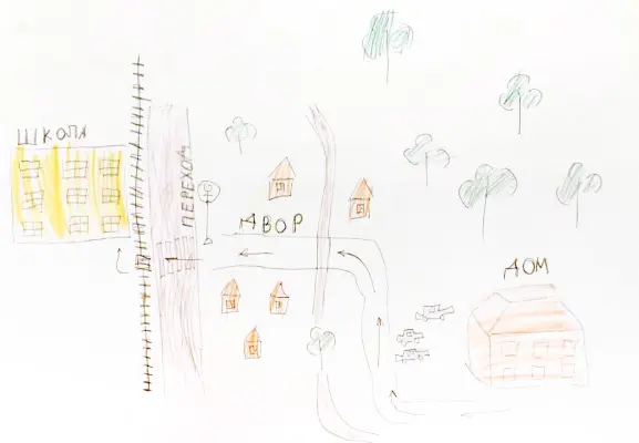 Рисунок выполнен цветными карандашами. Наша большая школа огорожена красивым забором, рядом есть пешеходный переход, который очень важен. Из окон моего дома виднеются деревья и кустарники.