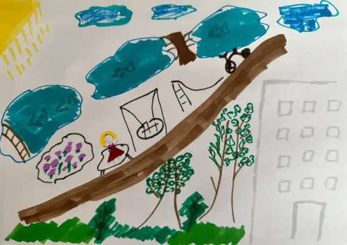 В нашей деревне все есть — и качели, и песочницы, разные площадки с каруселями, по дорожкам можно кататься на велосипеде и на самокате, в прудах водится рыба, на них есть мостики.