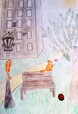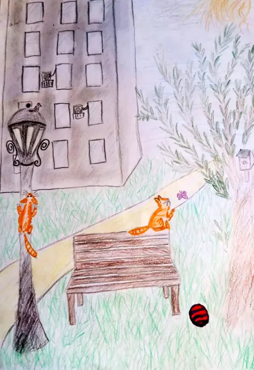 Работа выполнена карандашом. Обозначает прекрасную экологию нашего района, где живёт много птиц и даже встречаются белки. Во дворе без машин можно безопасно играть!